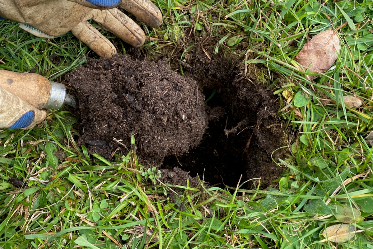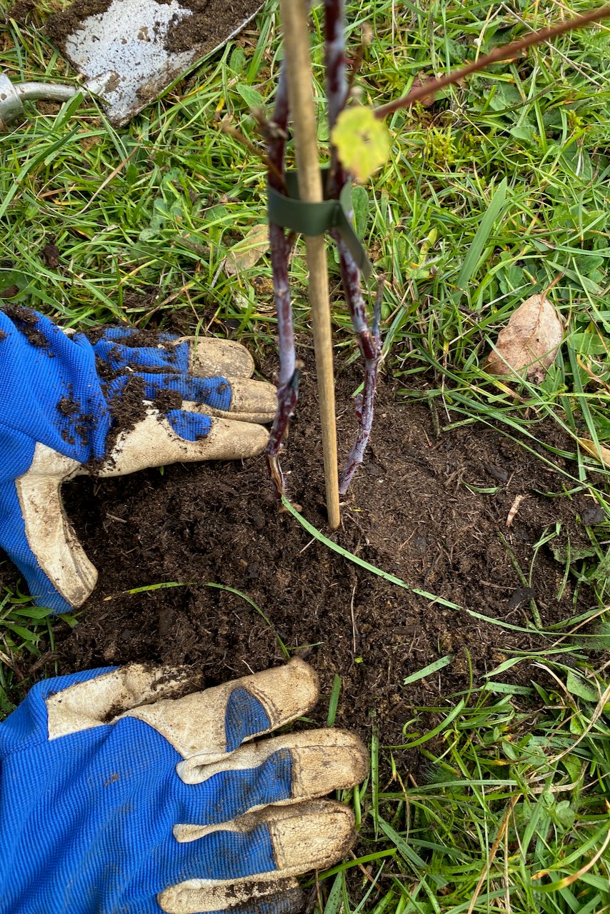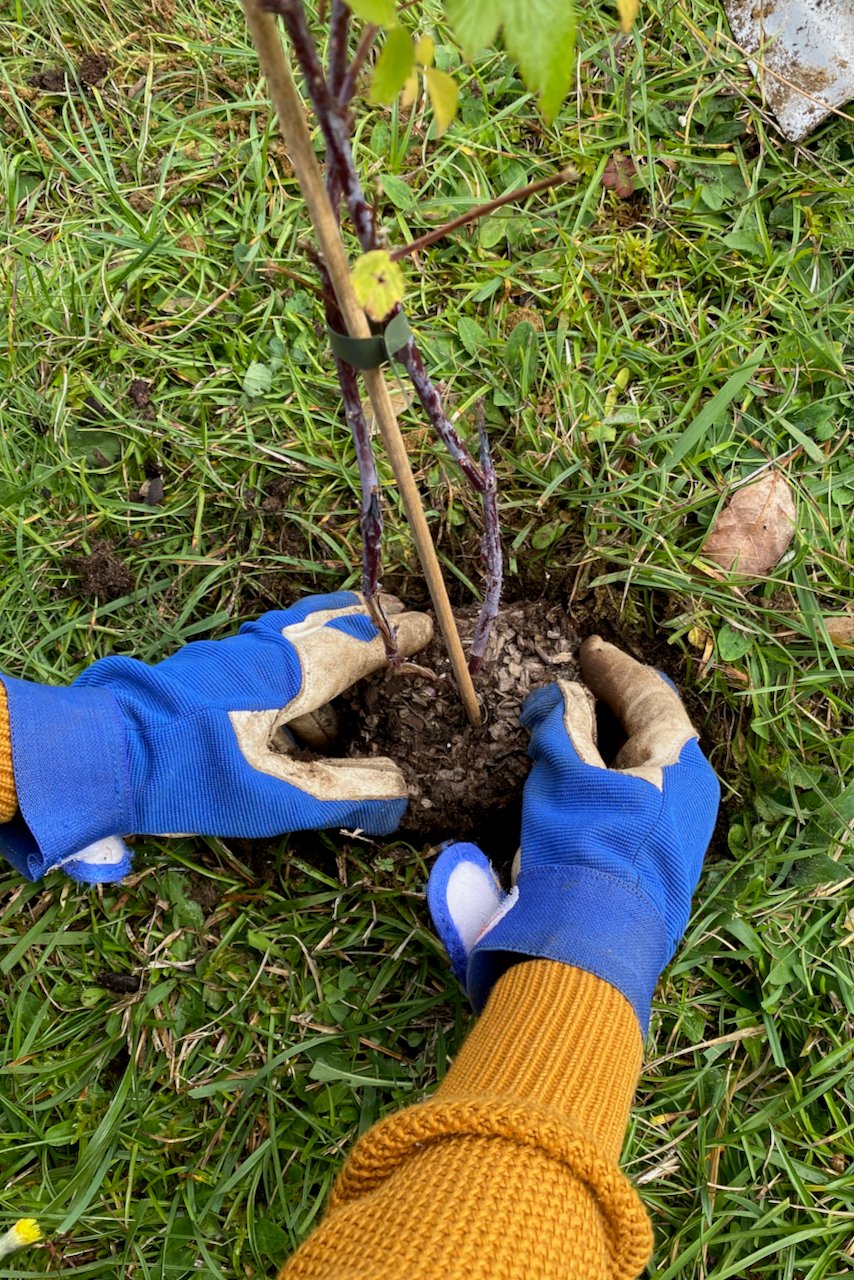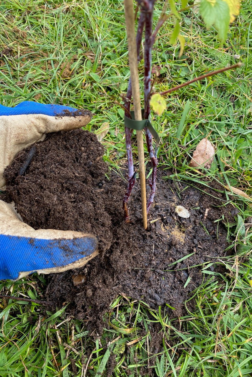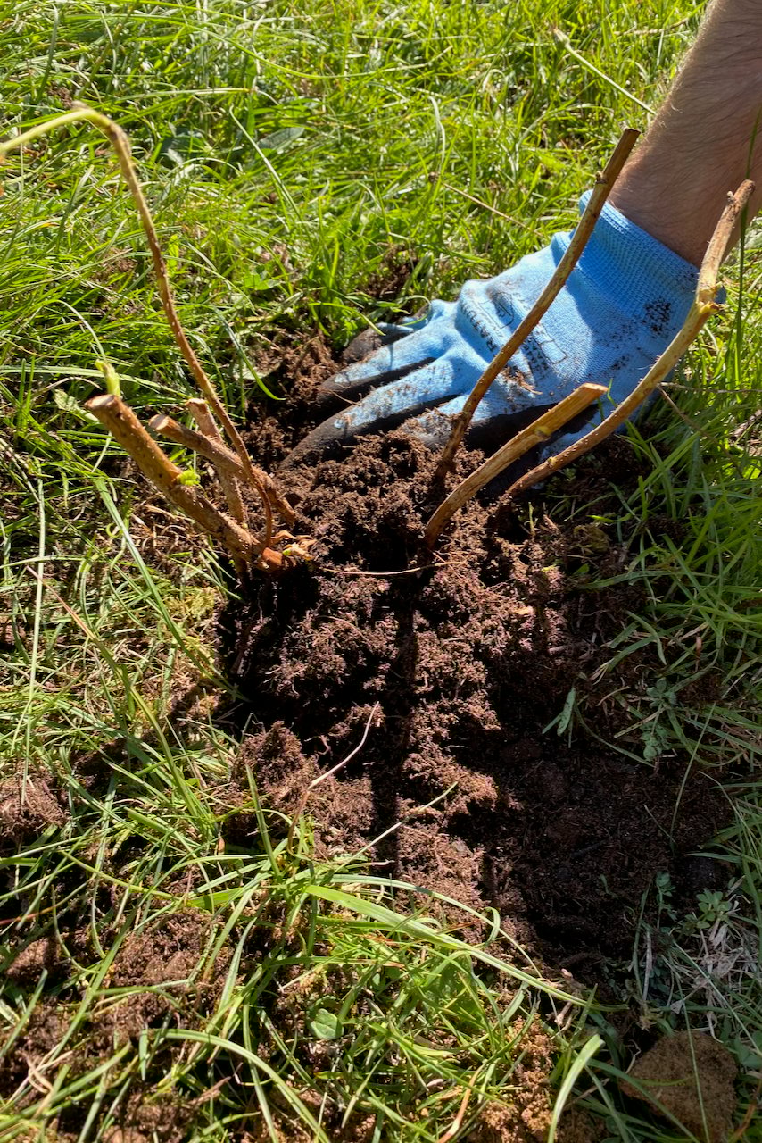 Whether you’re starting with bare root canes or potted plants, dig a hole twice the size of what you’re planting, then fill it back up with fresh compost.