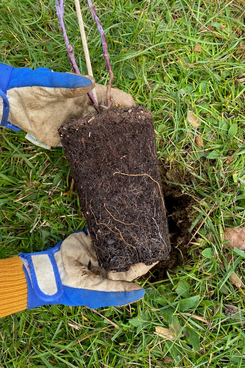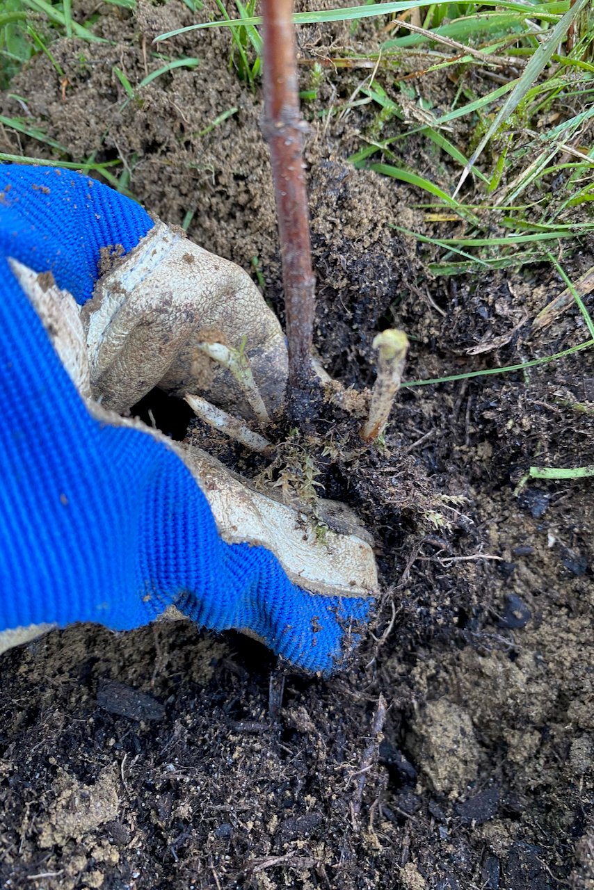 If you’re planting bare roots, just the root part and at most a couple of inches above it should go below ground. We want the plant to be well-anchored (so not too shallow), but not have too much of the stem underground.