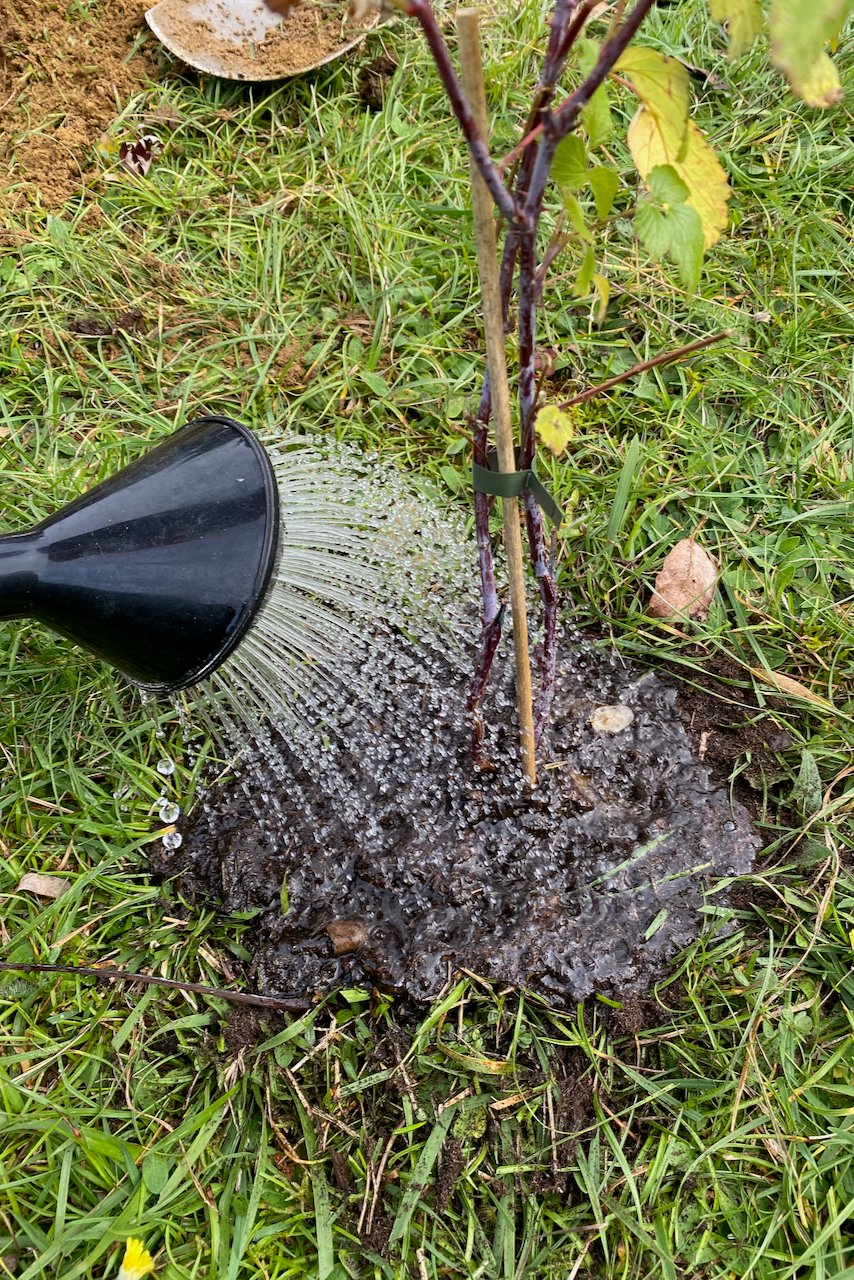 No planting session is finished until we’ve watered everything thoroughly… twice. The purpose is not just to hydrate the baby raspberries, but also to eliminate the air pockets that we left behind when planting. (I always do this through watering, never through stomping on the ground around the plant.)