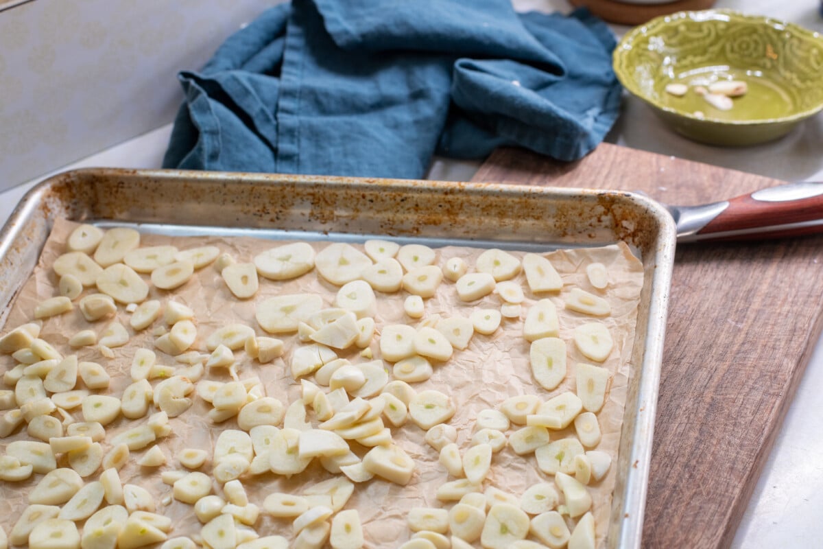Spread out the garlic on the baking sheet, making sure there aren’t bunches of sliced garlic stuck together.