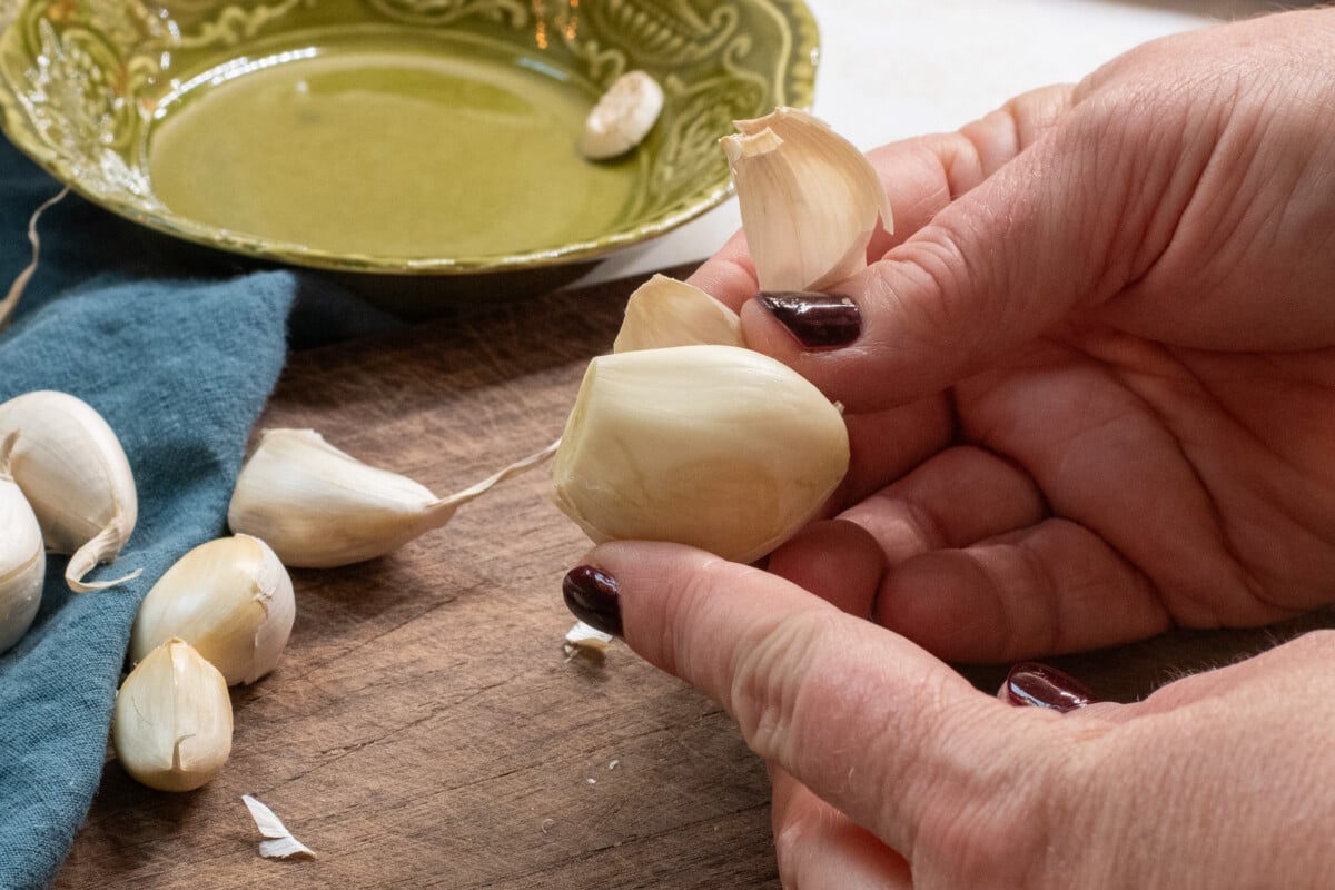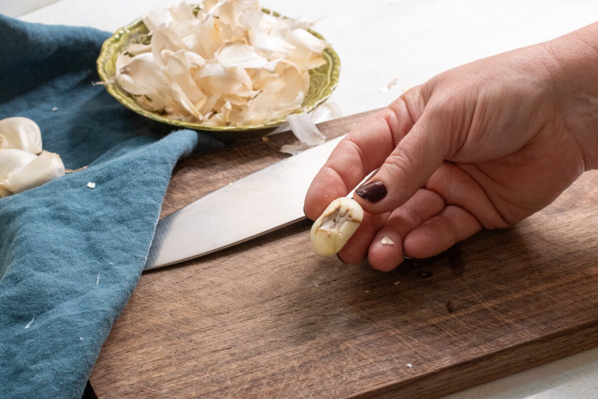 Separate the cloves from the bulb, then peel each clove. I have tried all the fancy garlic-peeling hacks (you can read my findings here), but there is only one that I use every single time. It’s the fastest and easiest.