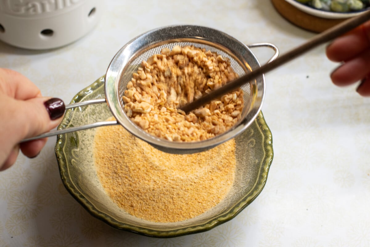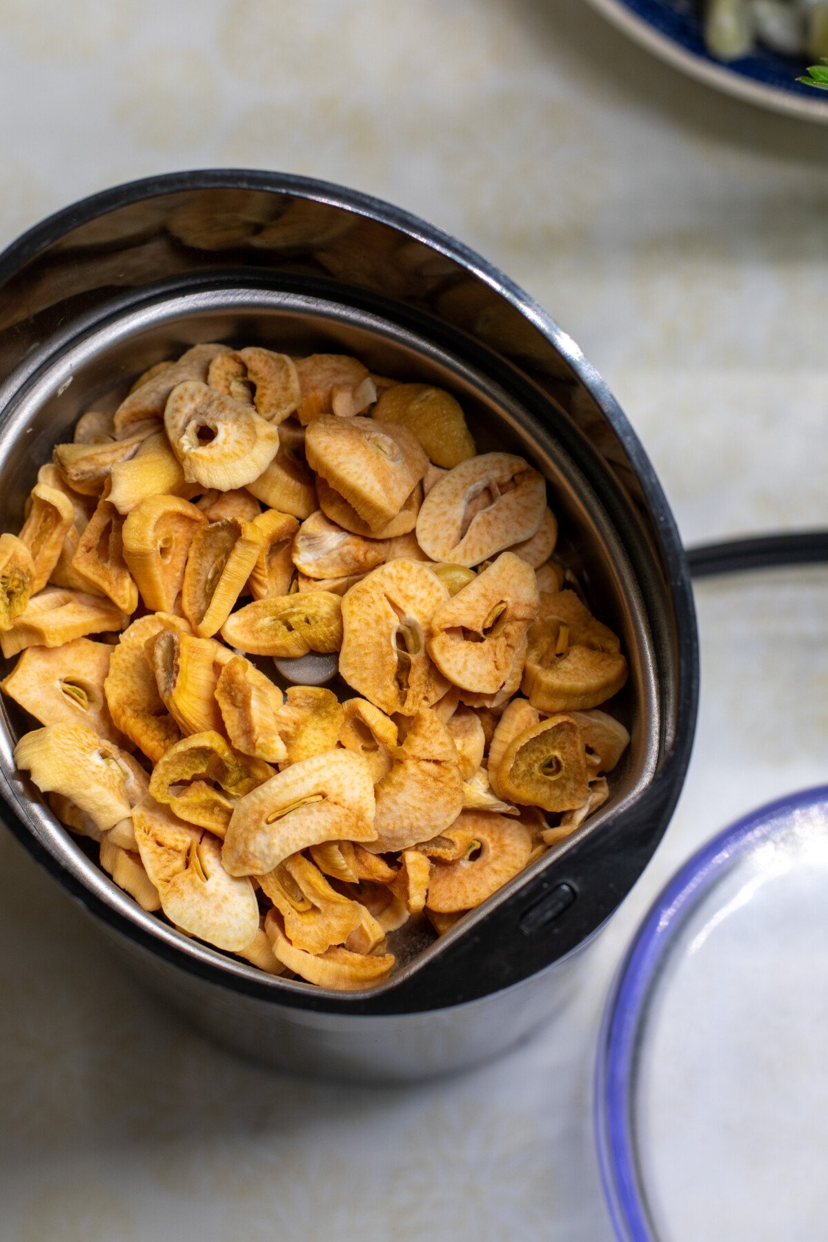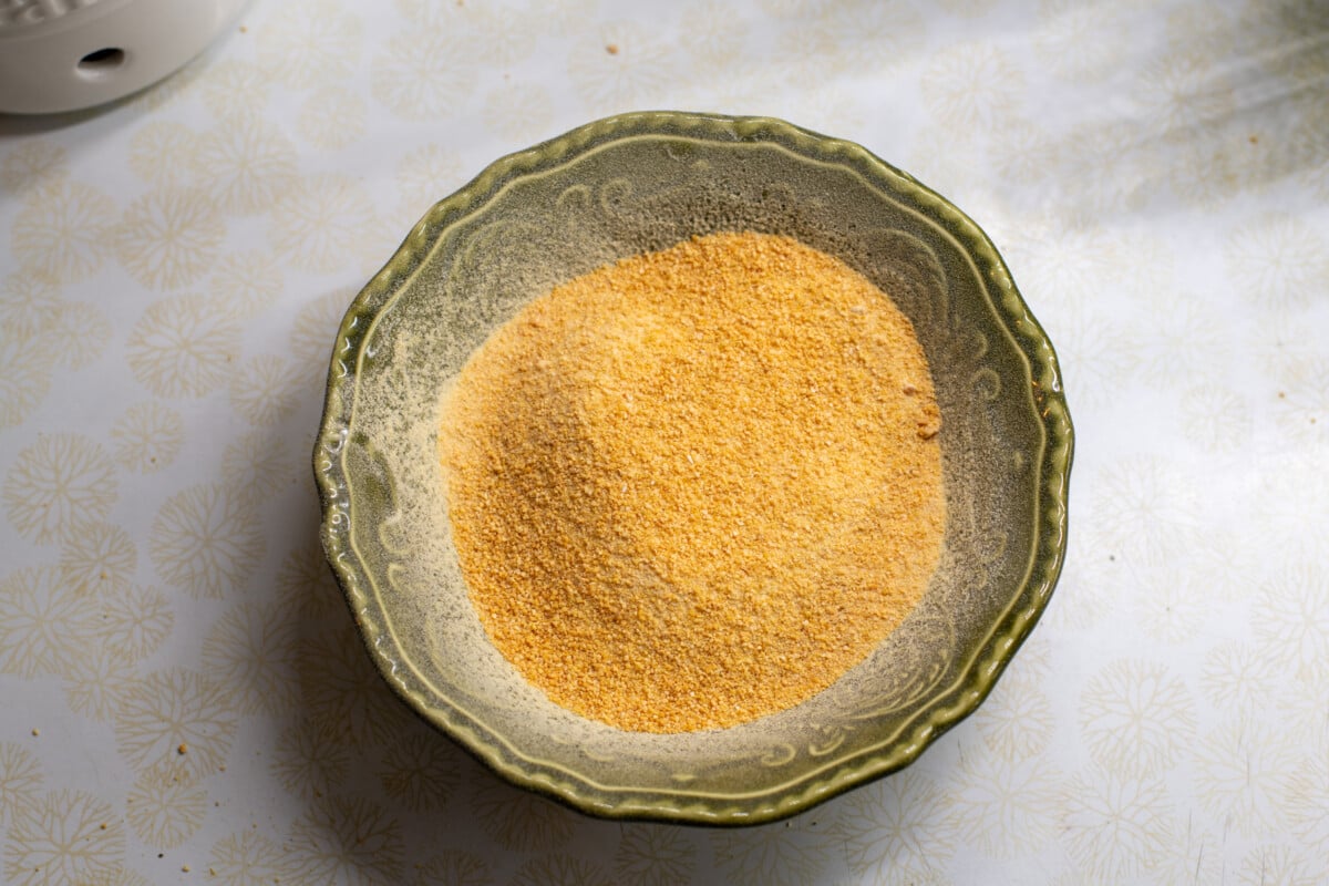 Once your garlic is completely cool, it’s time to grind your crispy little garlic chips into powder. Using your blender or spice grinder, pulse the chips for a few seconds at a time until they’re the desired consistency you want.