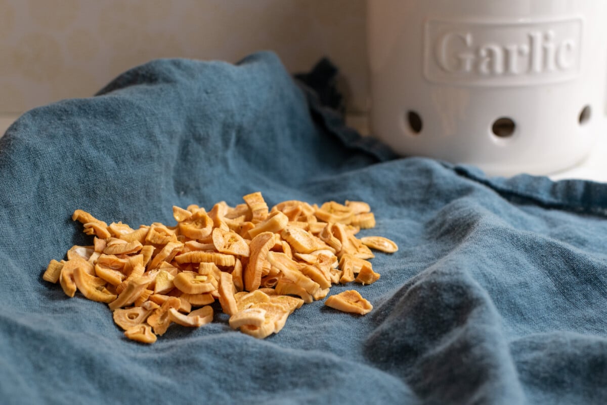 The goal is to slowly bake the moisture out of your garlic slices at a low temperature. The temperature must be low; otherwise, the garlic will be overly browned and taste bitter.