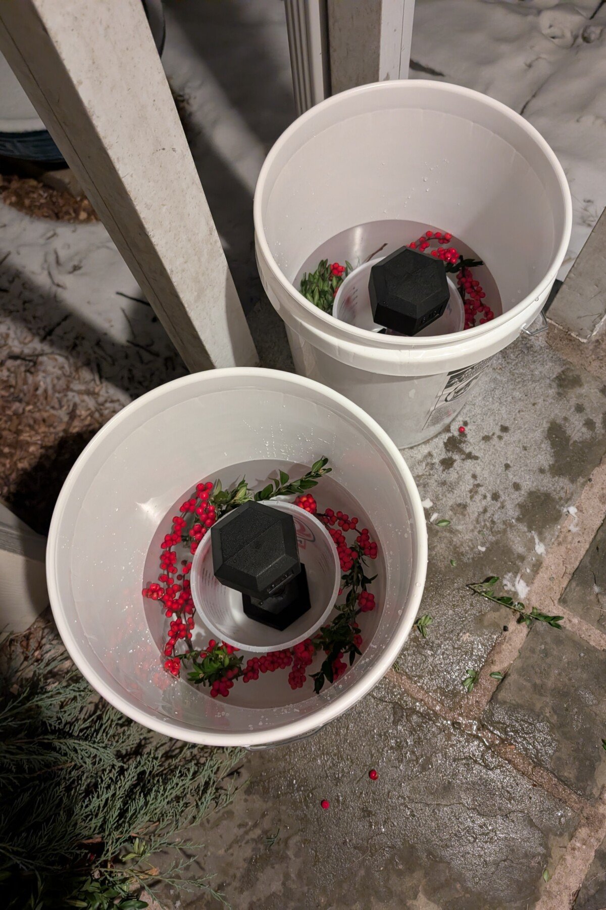 I ended up using my 8lb dumbbells. Just be sure you have everything set up outside, where you’re going to let your buckets sit to freeze before you pour in the water, as you’re likely to tip over the dumbbells if you move the bucket once there is water in it. (Go ahead, ask me how I know.)