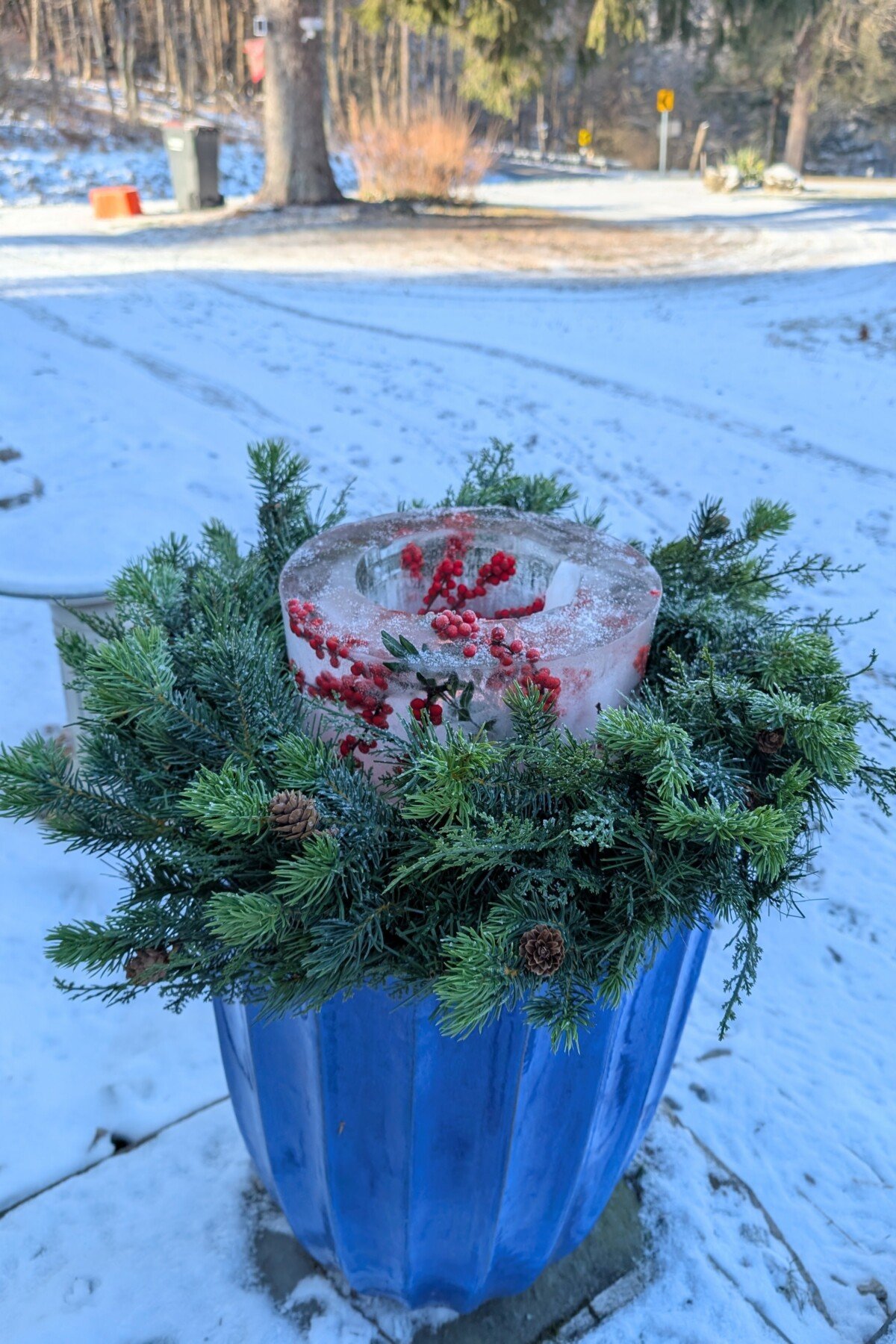 This past summer, I purchased two large pottery urns to go along my walkway up to my door. I knew as I brought them home that I was going to put wreaths on them and put ice luminaries on them. If you have planters next to your door, you can do the same.